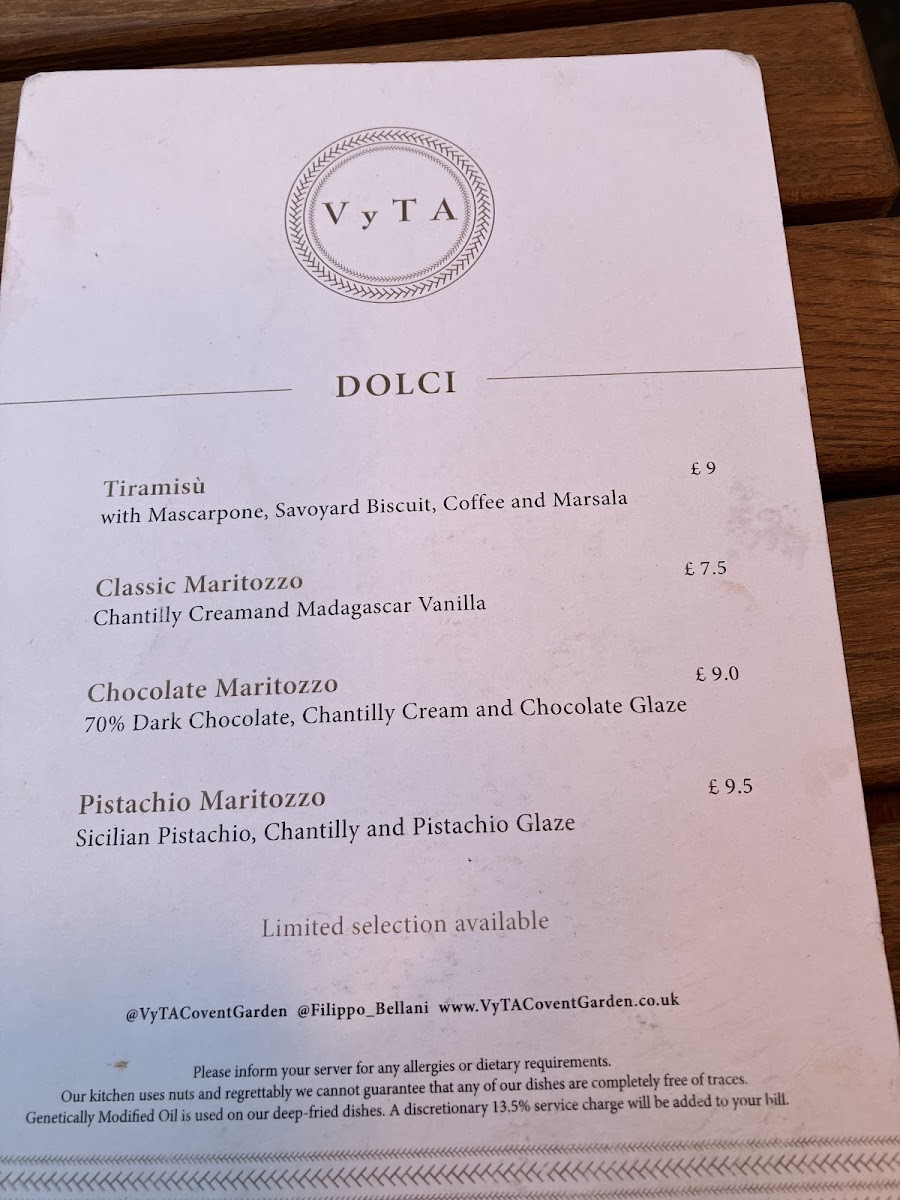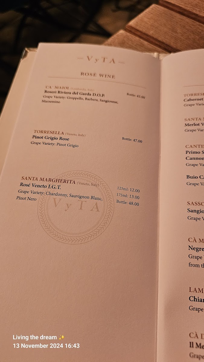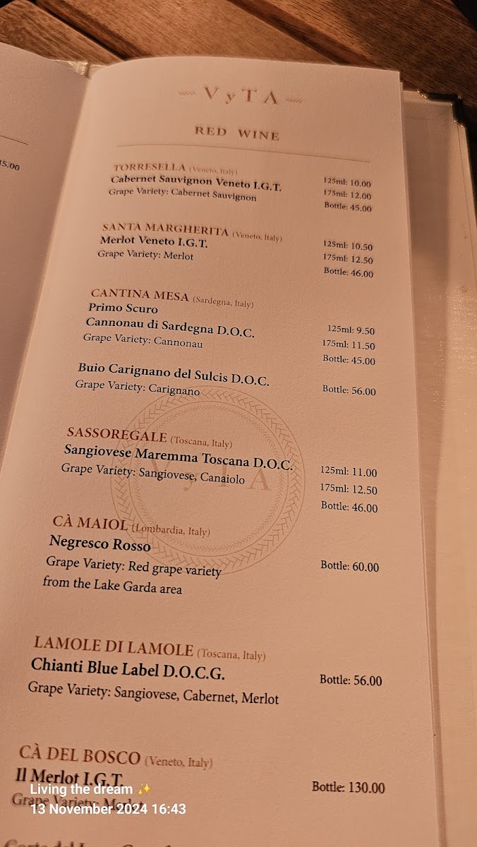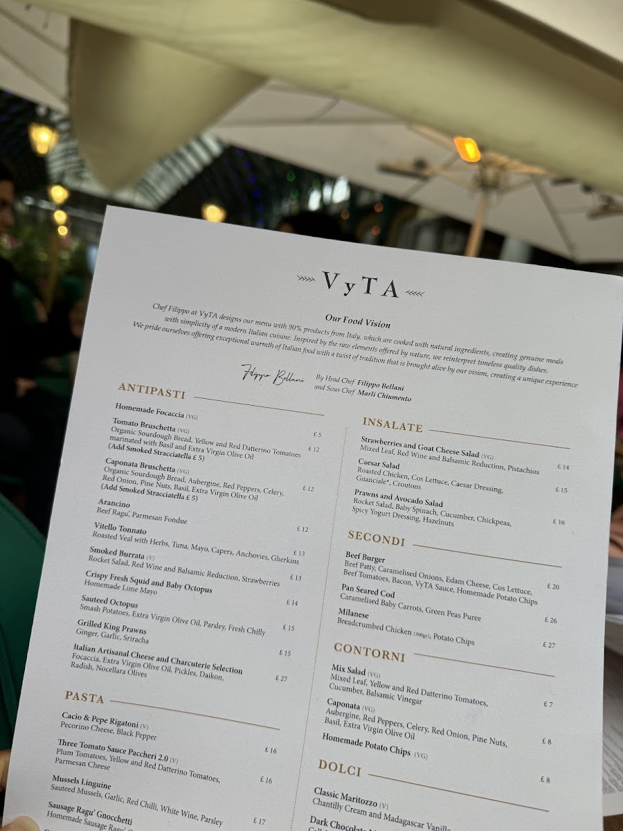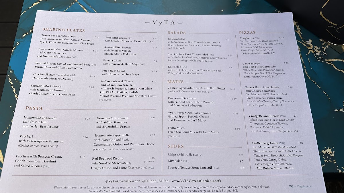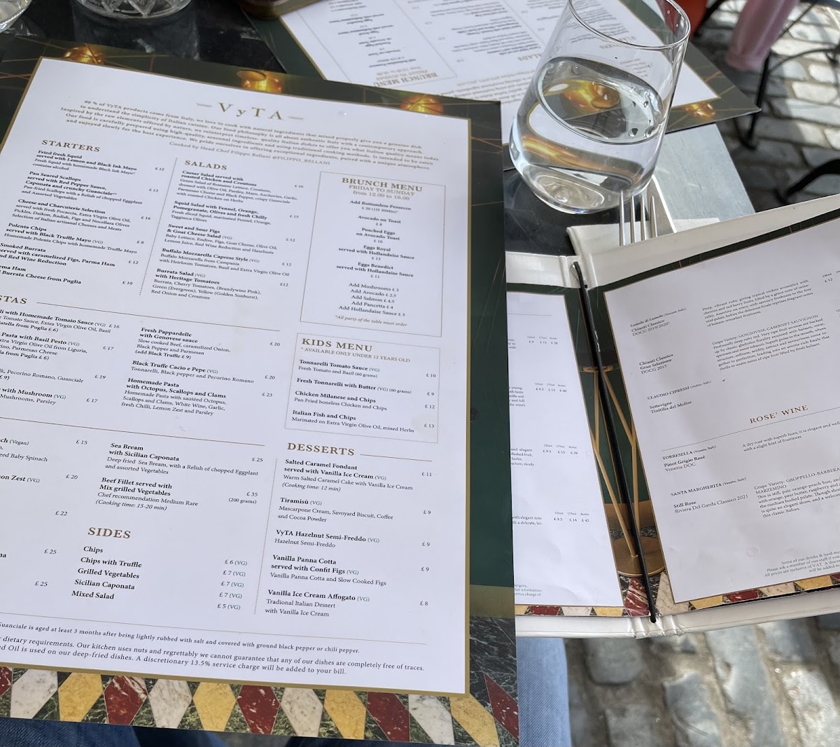 Portions are moderate, designed to complement a multi-course meal rather than overwhelm, and prices reflect its prime location and premium quality-expect mains in the £20-£30 range. Vyta also boasts an impressive wine list featuring regional Italian labels, thoughtfully paired with menu offerings by knowledgeable staff.